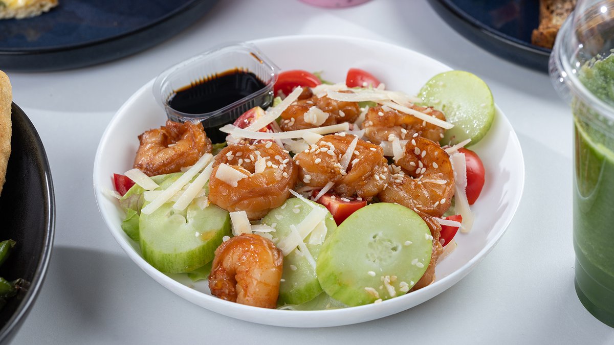 Shrimp, iceberg, cucumber, tomato, nuts, sesame seeds, parmesan, teriyaki sauce. Protein 42, fat 15, carbohydrate 13.5; 370 kcal.