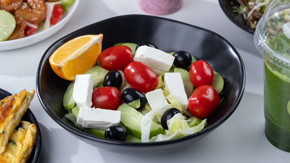 Feta, olives, cucumber, tomato, bell pepper, olive oil, lemon. Protein 10.5, fat 27, carbohydrates 9; 330 kcal.