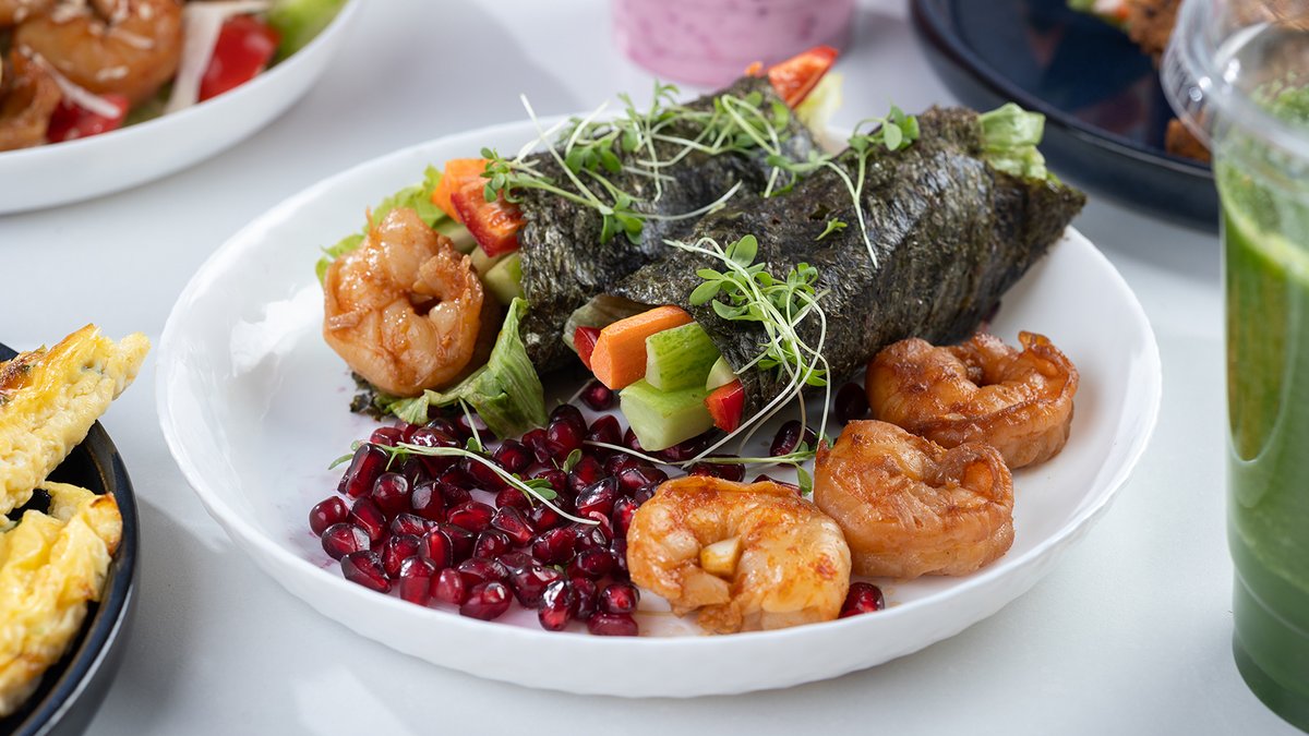 Shrimp, cucumber, spinach, rice, nori. Protein 36, fat 4, carbohydrates 39; 340 kcal.