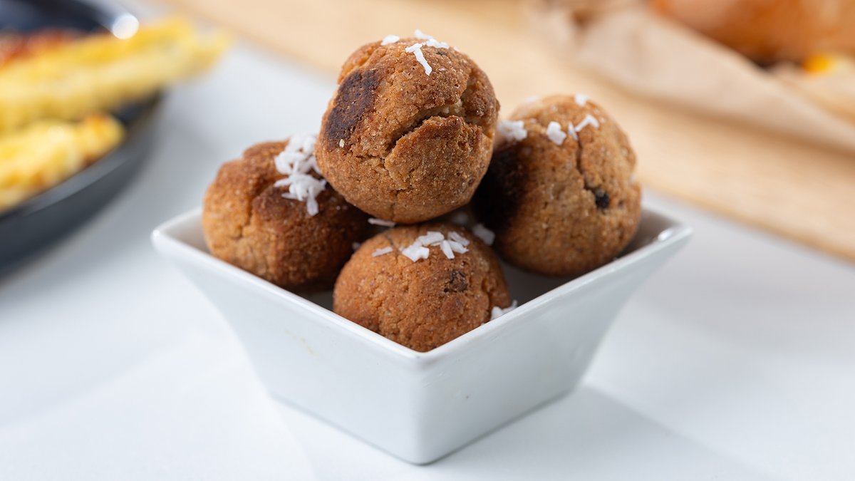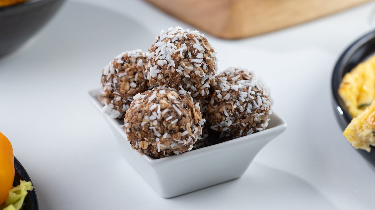 Oats, coconut flakes, peanut butter, flax seeds, Chia seeds, dark chocolate, honey. 150 kcal