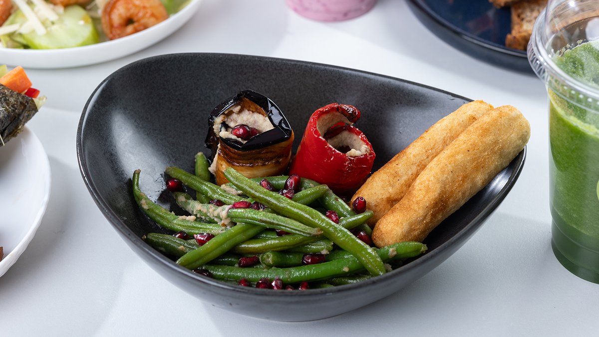 Eggplant, Bell peppers, green beans, walnuts, corn flour. Protein 16, fat 33, carbohydrates 44; 500 kcal.