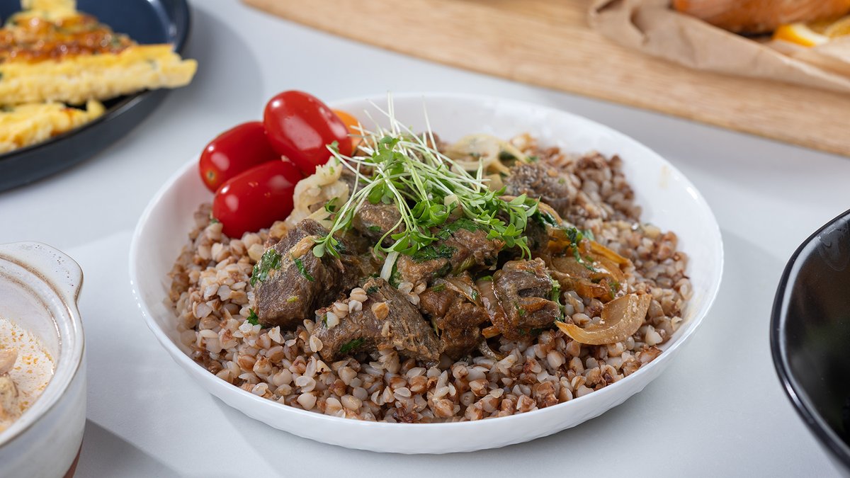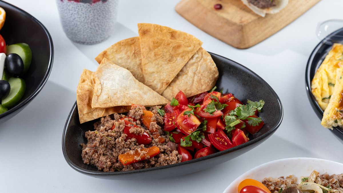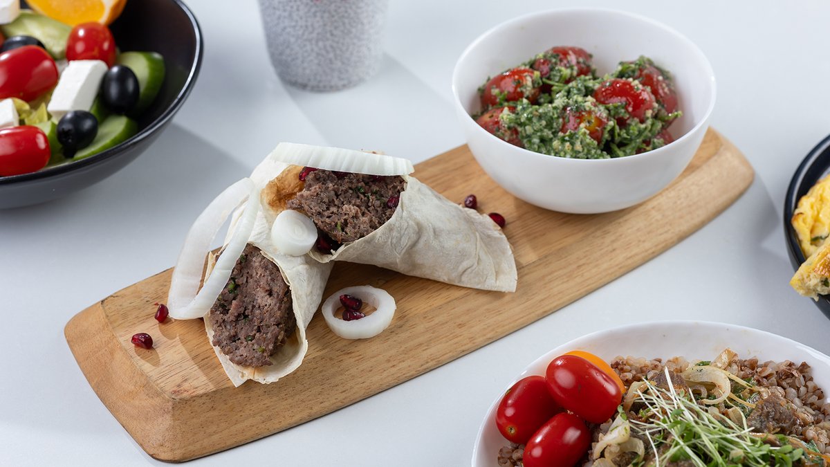 Beef patty, buckwheat, tomato, onion, mint, parsley, lemon, olive. Protein 36, fat 30, carbohydrates 25; 530 kcal.