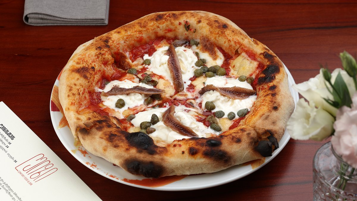 Marinara sauce, mozzarella, gouda, mixed olives, capers, stracciatella, anchovies, olive oil