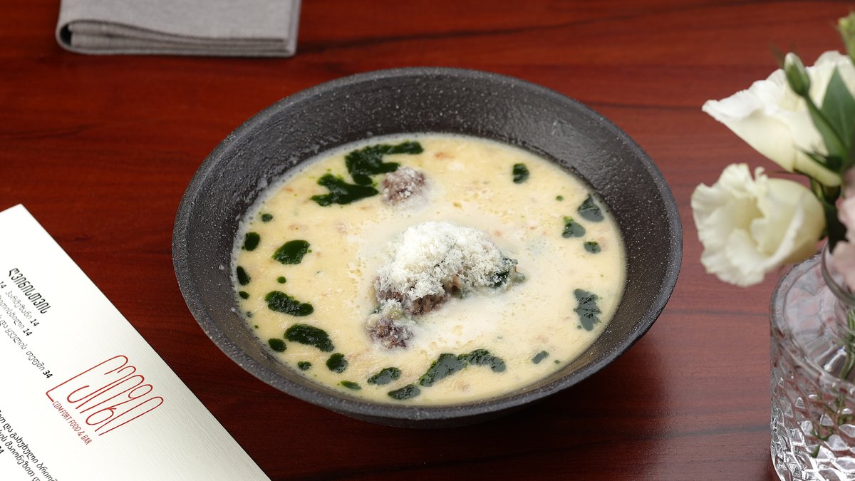 Chicken broth, beef meatballs, potatoes, carrots, bacon, Parmesan, green oil, cream