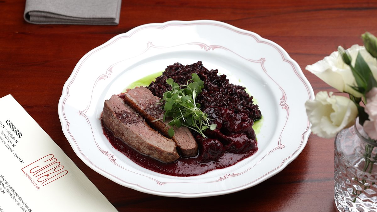 Duck breast, blackberry sauce, wild rice,butter, dried beetroot