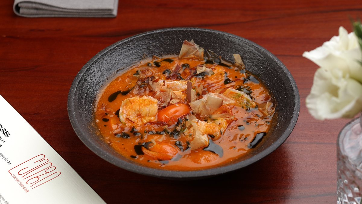 Fish and tomato broth, salmon, shrimp, cherry tomatoes, green oil, bonito flakes