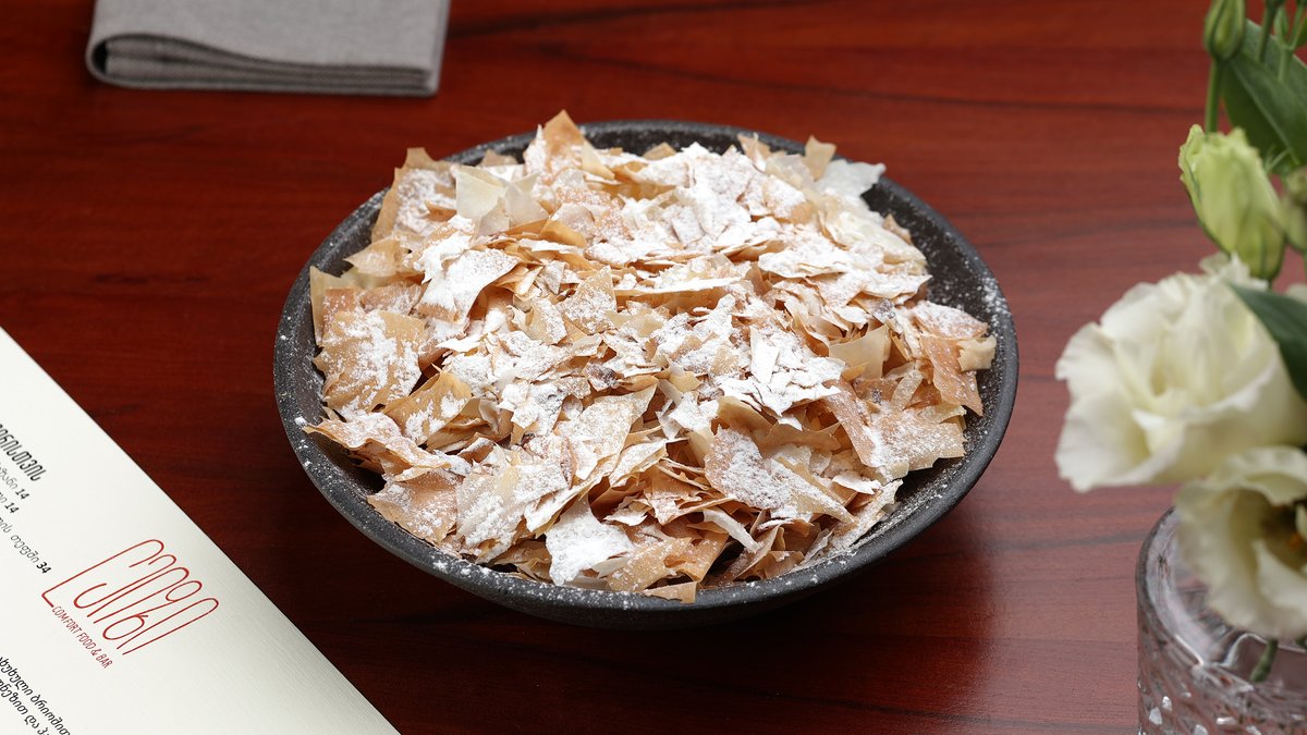 Baked filo dough, pear compote, crème pâtissière, powder sugar