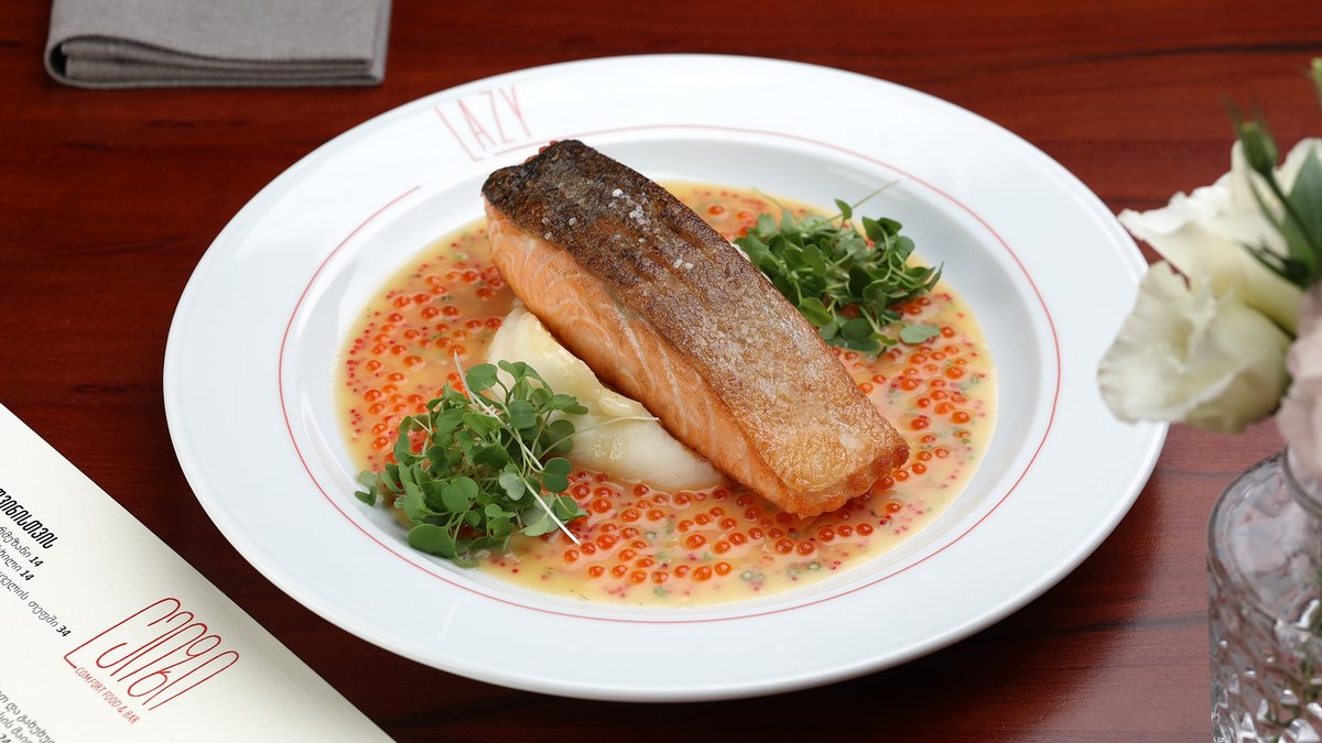 Salmon gravlax, cream cheese, avocado, caviar, mizuna, brioche