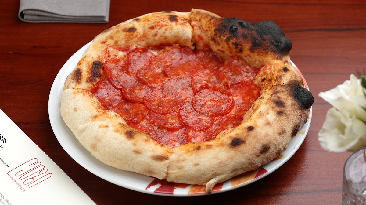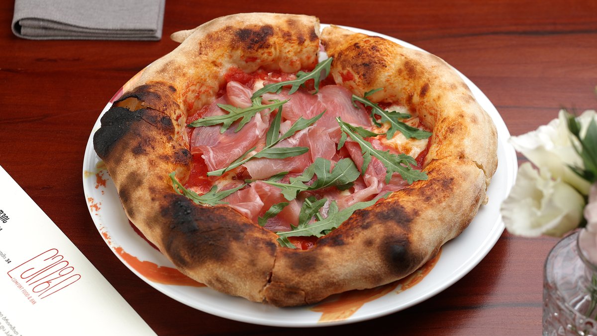 Marinara sauce, mozzarella, gouda, Parma coppa, arugula