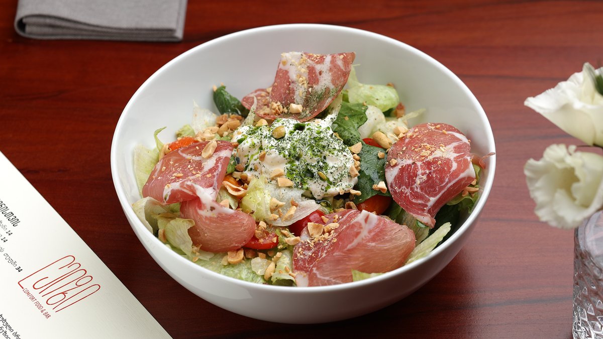 Mixed salad, lime drassing, parma ham, stracciatella, roasted hazelnuts, cherry tomatoes, green oil, parsley powder