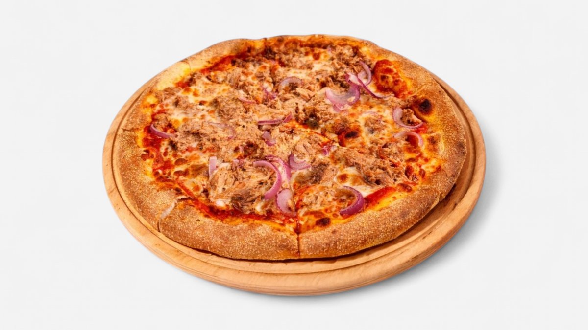ცომი, ტომატი, მოცარელა, პარმეზანი,ტუნა და წითელი ხახვი.