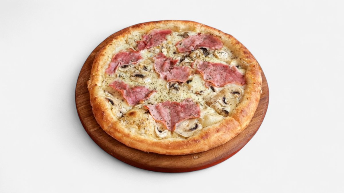 ცომი, ნაღების სოუსი, მოცარელა, პარმეზანი, ლორი, შემწვარი სოკოთი.