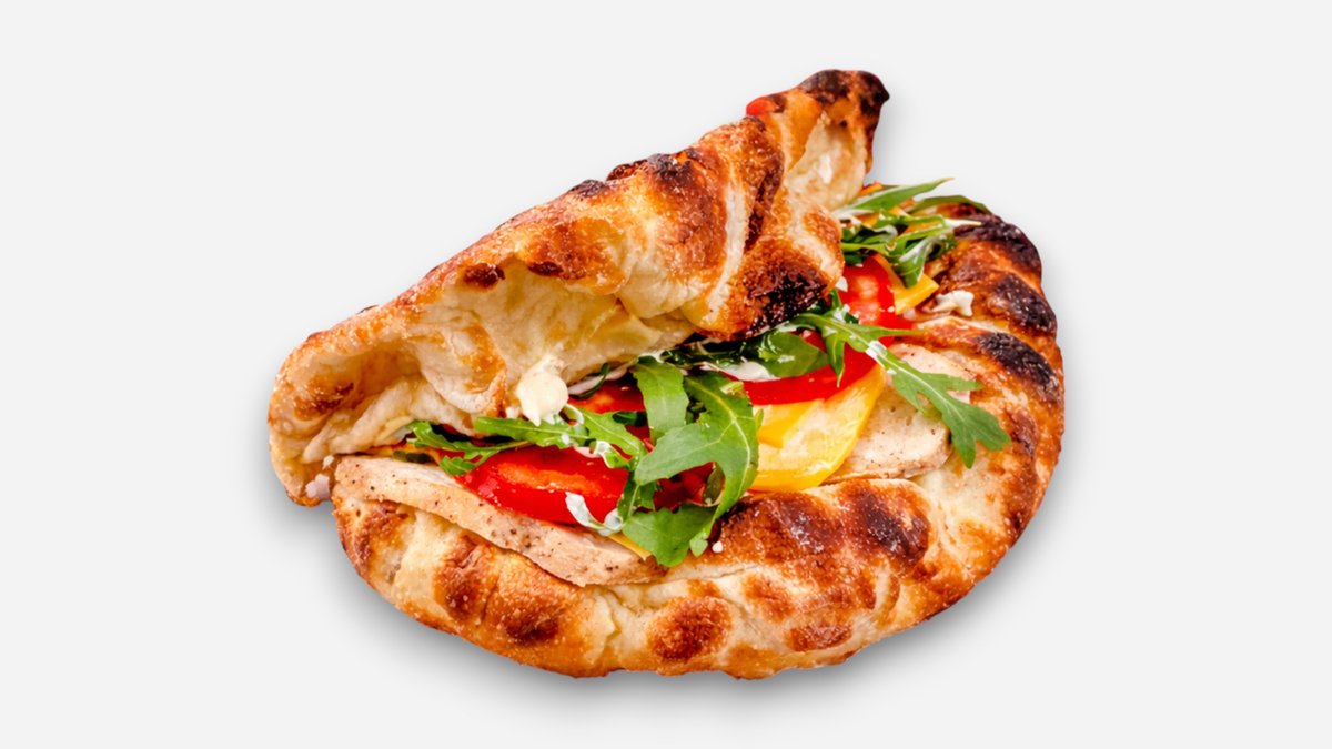 ცომი, ქათამი, ჩედარი, პომიდორი, რუკოლა, სოუსი