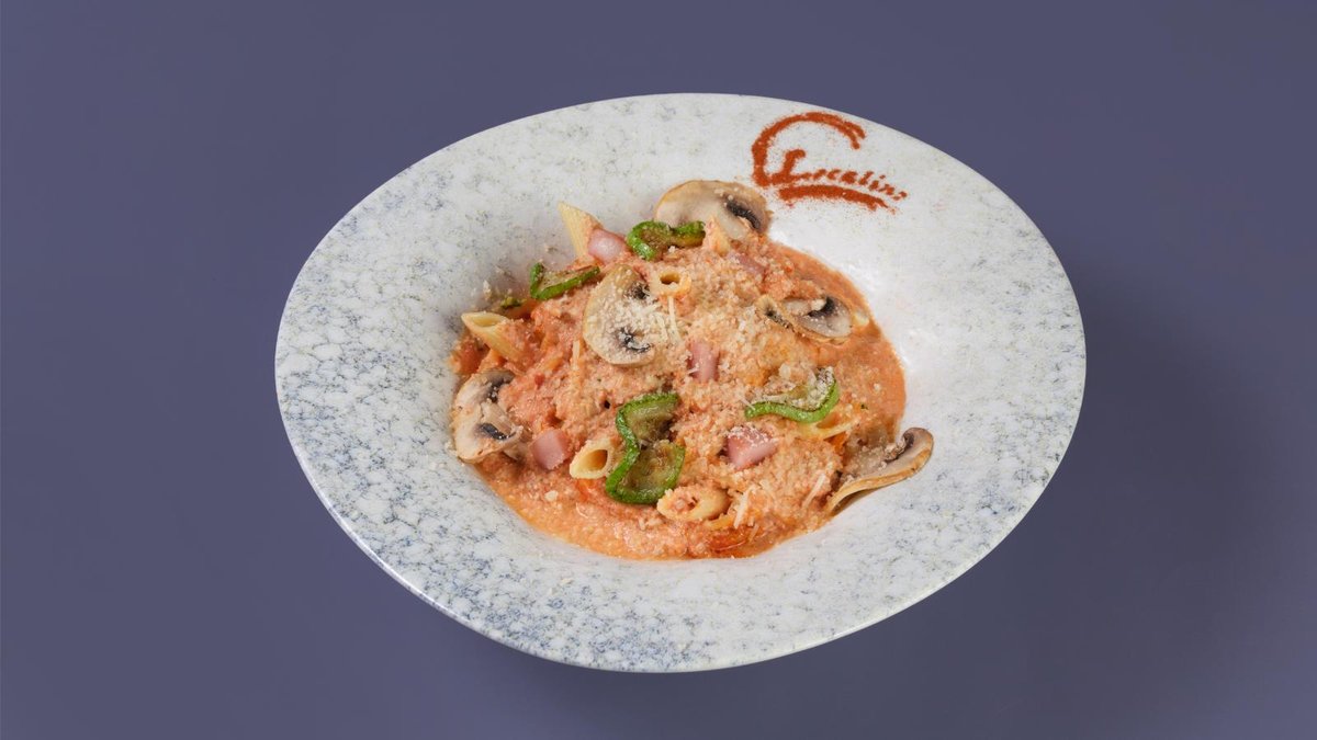 ტომატის სოუსი, ყველი სალამი, ლორი, ქამა სოკო