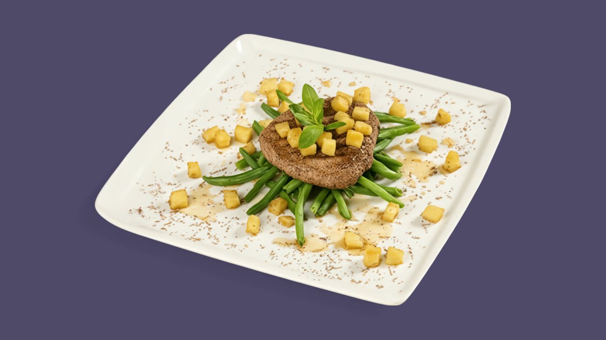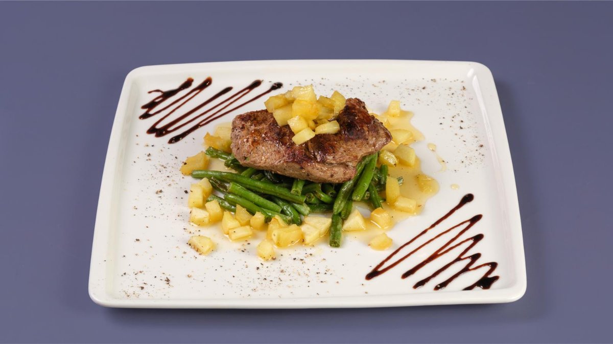 გრილზე შემწვარი საქონლის ფილე 280 გრ ფრანგული ლობიოთი , კარამელიზირებული მწვანე ვაშლით, მოტკბო-მომჟაო სოუსით.