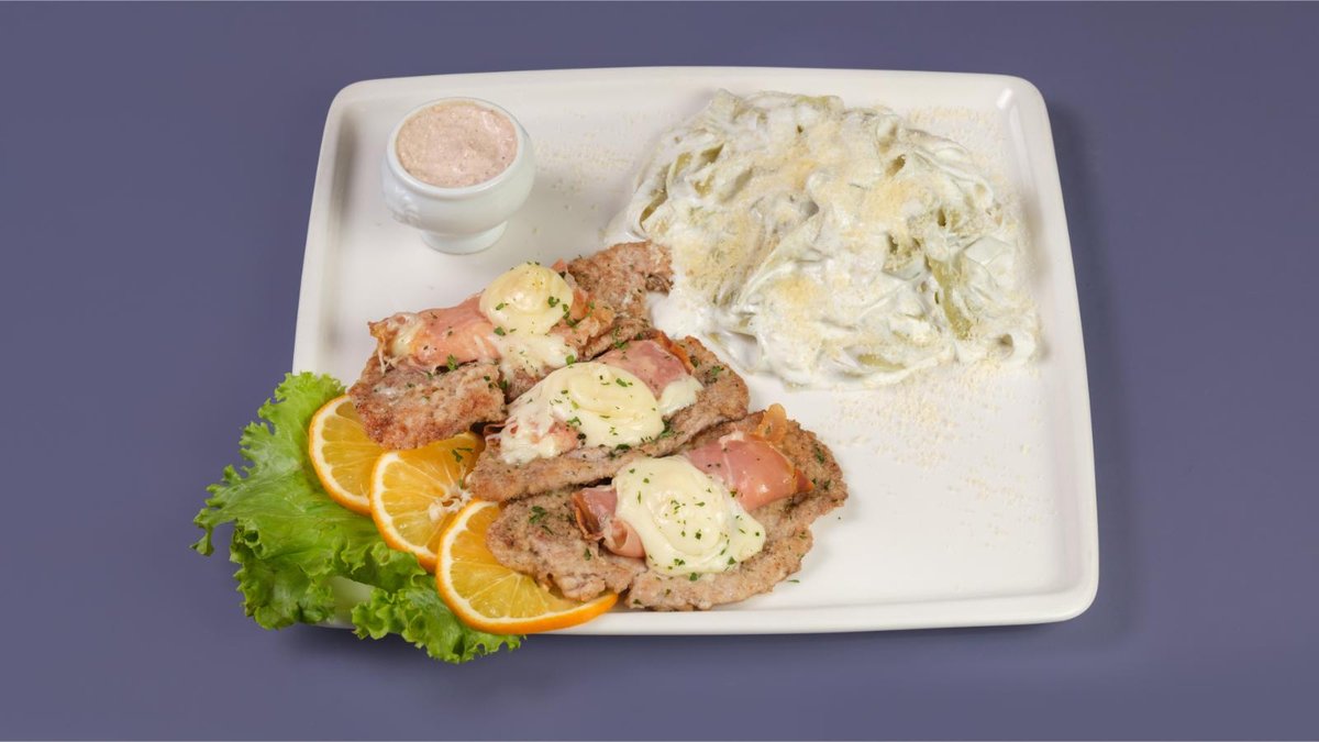 ღუმელში გამომცხვარი ღორის შნიცელი 3 ნაჭერი, პომიდორით, ქამა სოკოთი და ნაღების სოუსით.