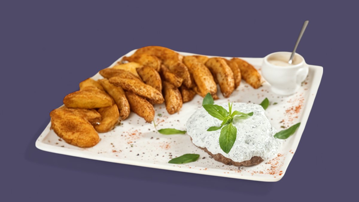 გრილზე შემწვარი საქონლის ფილე 280 გრ ყველით, მდოგვით, ნაღების სოუსით და კრეოლური კარტოფილის გარნირით.