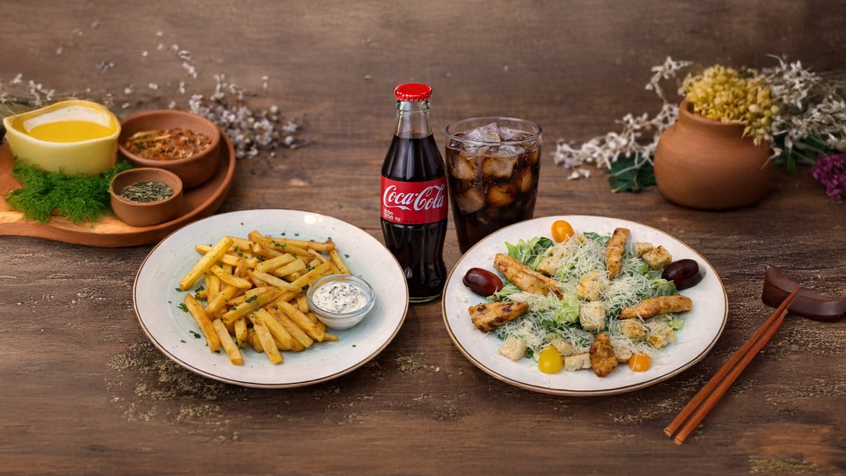 A flavorful combo with Georgian Salad with caramelized nuts, Parmesan Truffle Fries, and Coca-Cola.