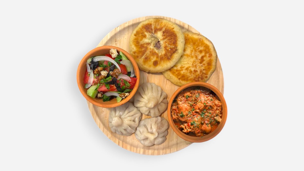 ქართული კერძების ასორტი: მინი ხაჭაპური და ლობიანი, ქართული სალათი, ცხელი ჩახოხბილი და სამი ცალი პატარა ხინკალი.