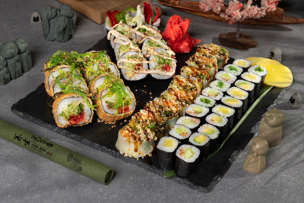 ვეჯი როლი - 8 ნაჭერი გამომცხვარი ბოსტნეულის როლი - 8 ნაჭერი სამარხვო როლი - 8 ნაჭერი ჰიაში მაკი - 6 ნაჭერი ტეკუანის მაკი - 6 ნაჭერი კიტრის მაკი - 6 ნაჭერი ავოკადო მაკი - 6 ნაჭერი
