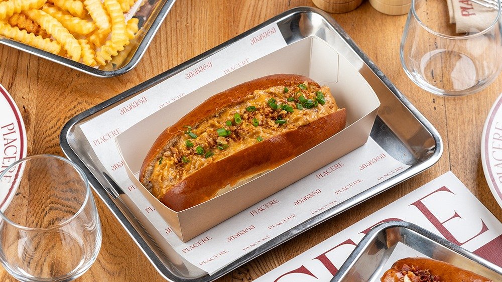 Brioche bread, slice of cheddar, ketchup, mustard, mayo, sweet pickle relish, crispy bacon, French fries