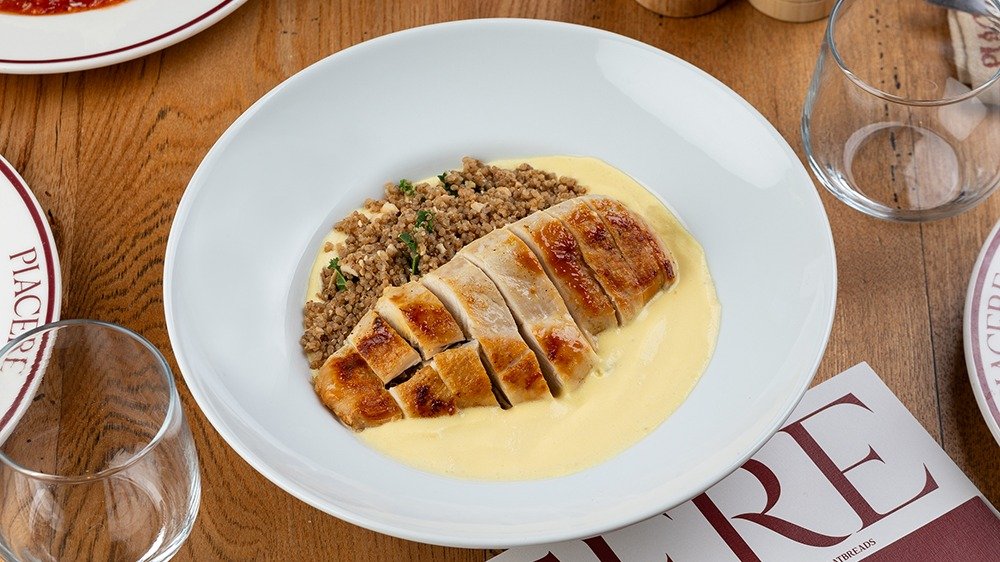 Grilled chicken fillet, quinoa, passion fruit cream, and kale