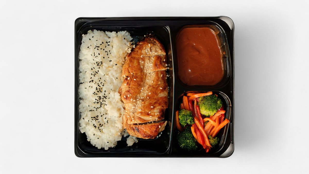 Grilled Chicken with Soy, Garlic, and Honey. Served with rice and grilled vegetables — carrot, red bell pepper, and broccoli.