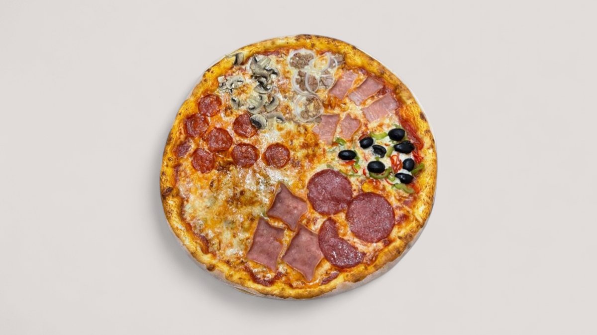 ტომატის სოუსი, ყველი, სოკო, ბულგარული, ზეთისხილი, სიმინდი ,ხახვი, ჰალაპენიო