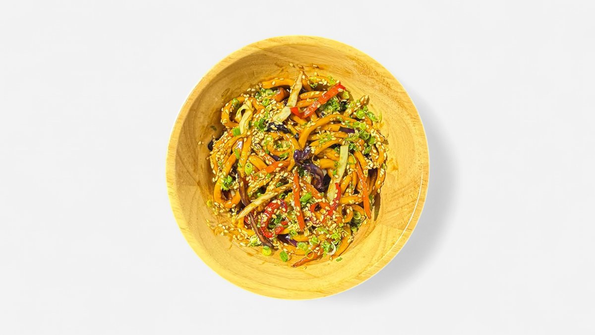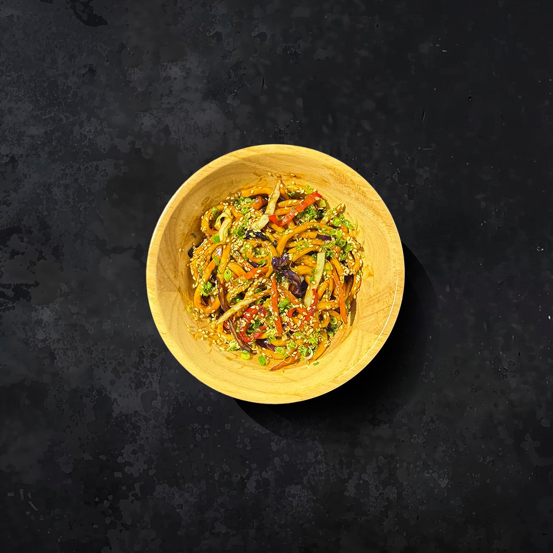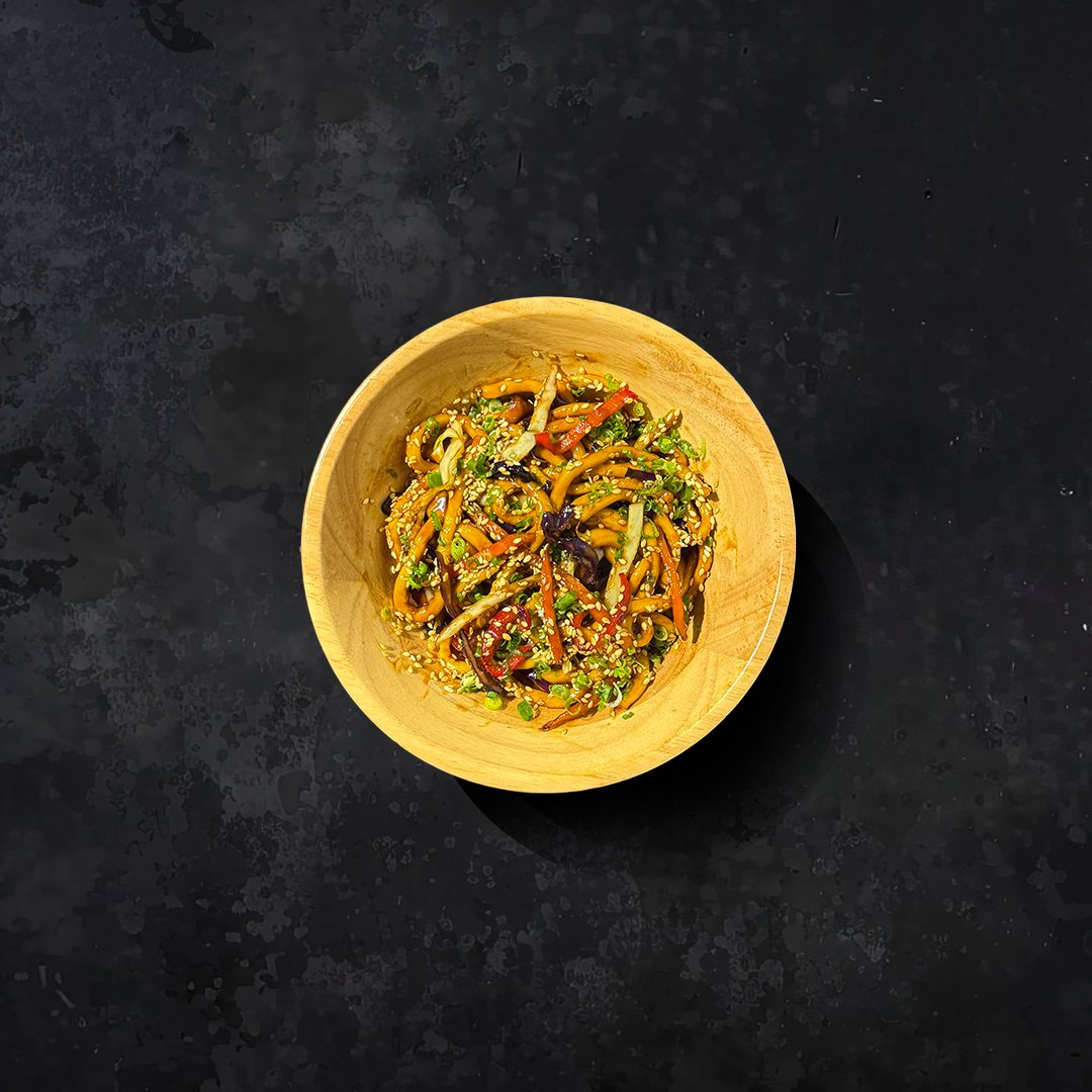 ატრია, დამარინადებული ქათამი, წითელი და თეთრი კომბოსტო, სტაფილო, წითელი ბულგარული, მწვანე ხახვი, სეზამის მარცვალი.