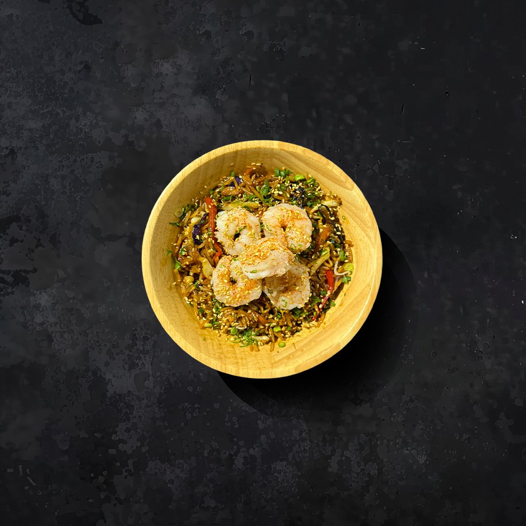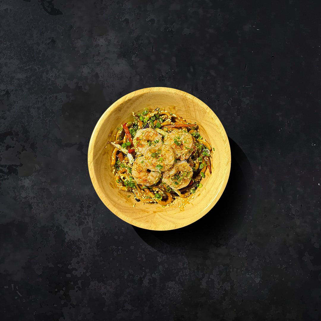 ატრია, კრევეტები, წითელი და თეთრი კომბოსტო, სტაფილო, წითელი ბულგარული, მწვანე ხახვი, სეზამის მარცვალი.