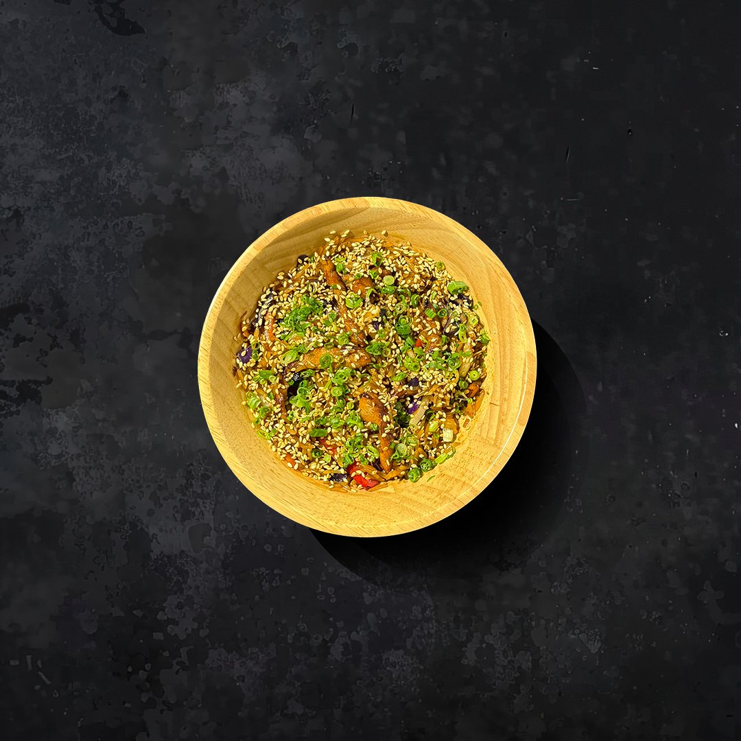 ბრინჯი, კრევეტები, წითელი და თეთრი კომბოსტო, სტაფილო, წითელი ბულგარული, მწვანე ხახვი, სეზამის მარცვალი.