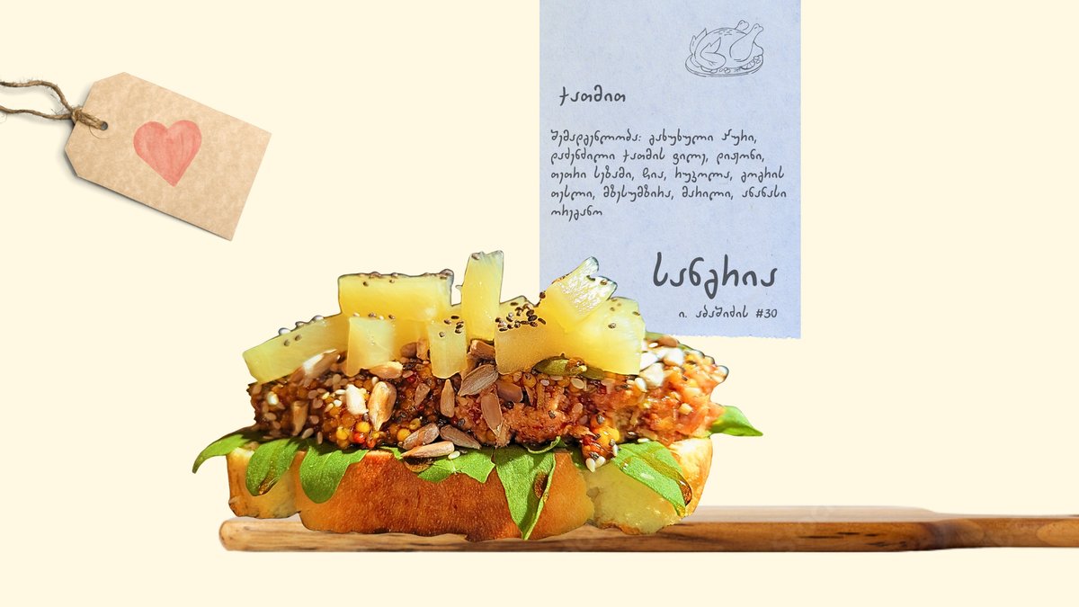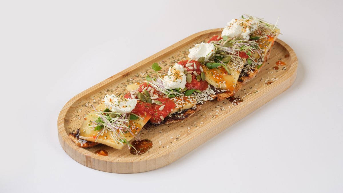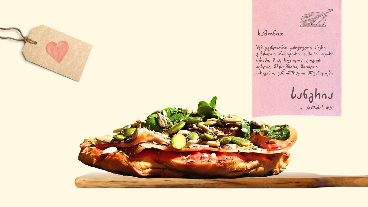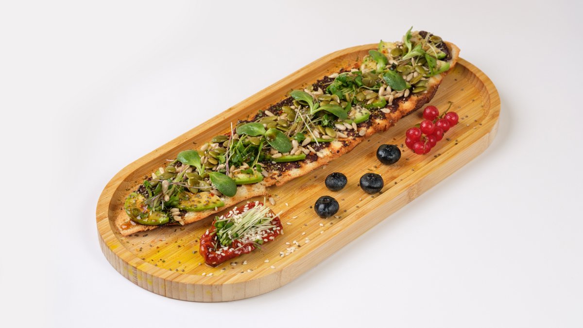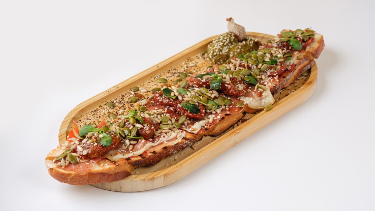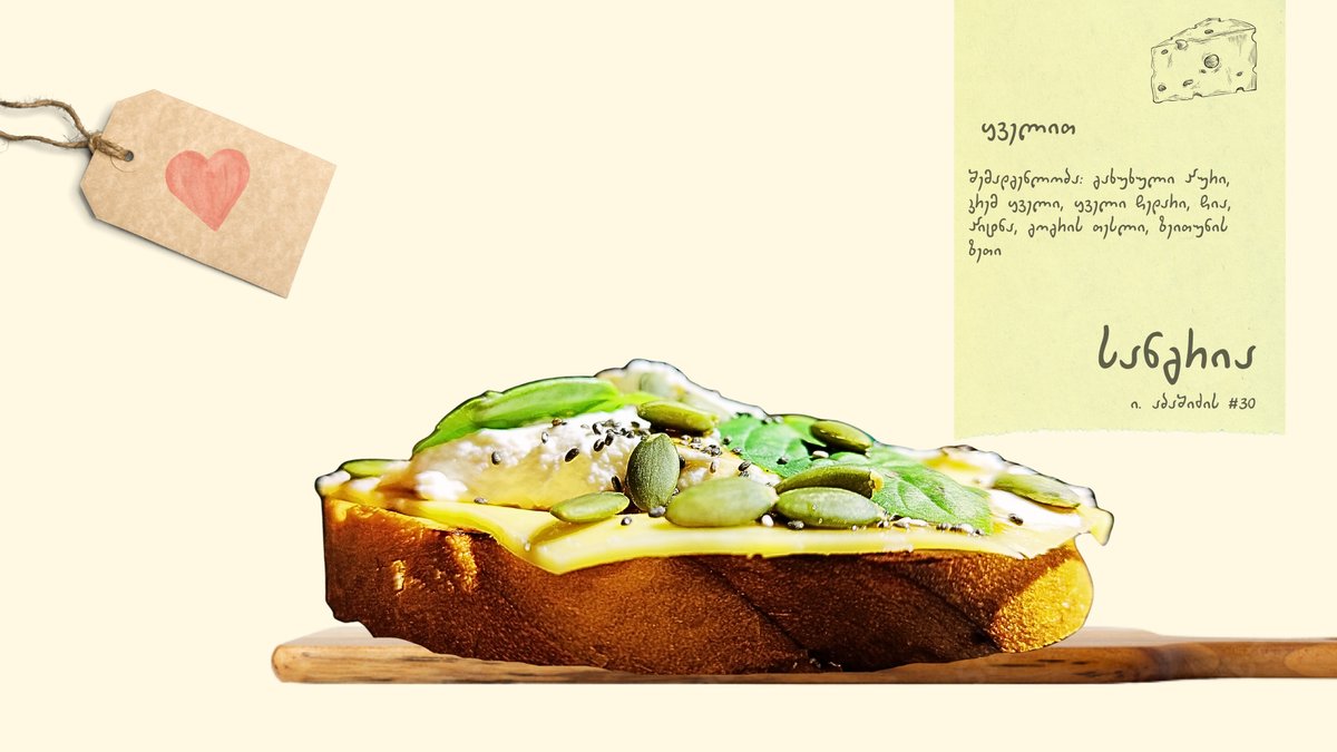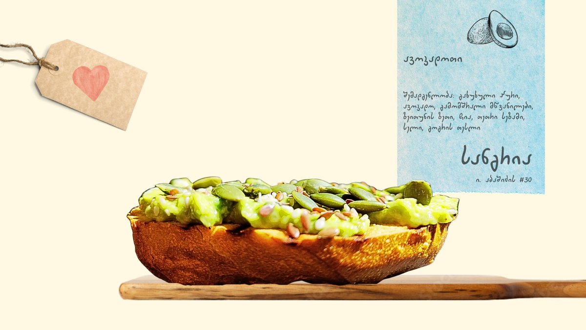 გახუხული პური ტრავანსი, ავოკადო, ლიმონი, ზეითუნის ზეთი, სეზამისა და ჩიას მარცვლები, მიკრომწვანილი, ტრიუფელის ზეთი, მზესუმზირის და გოგრის გული, ნარშარაფი