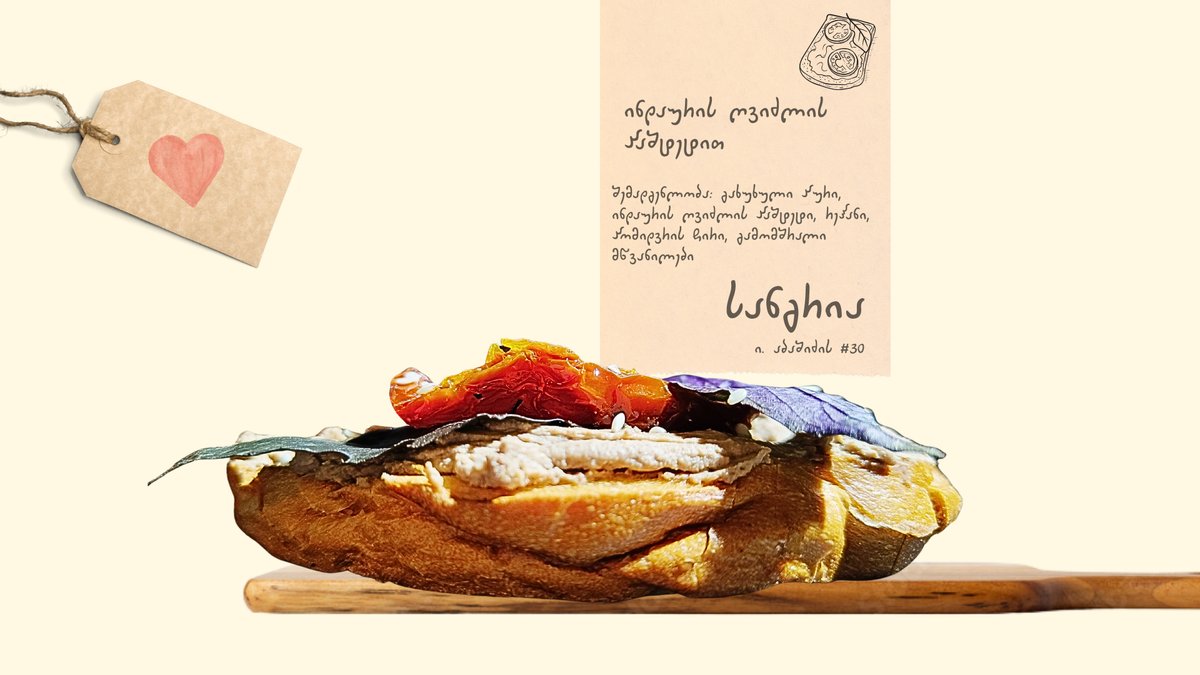 გახუხული პური ტრავანსი, ჩედარი, გახეხილი პომიდორი, ორეგანო, კრემყველი, ტკბილ-ცხარე სოუსი, სეზამი, ჩია, მზესუმზირის გული, გოგრის გული