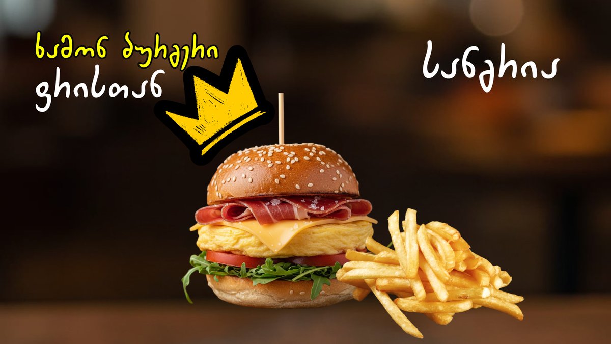 ესპანური ხამონის, ჩედარის, შემწვარი კვერცხის შეუდარებელი ნაზავი, რუკოლას ფოთლებით, პომიდვრით და ბარბექიუ სოუსთან ერთან. ფრისთან ერთად.