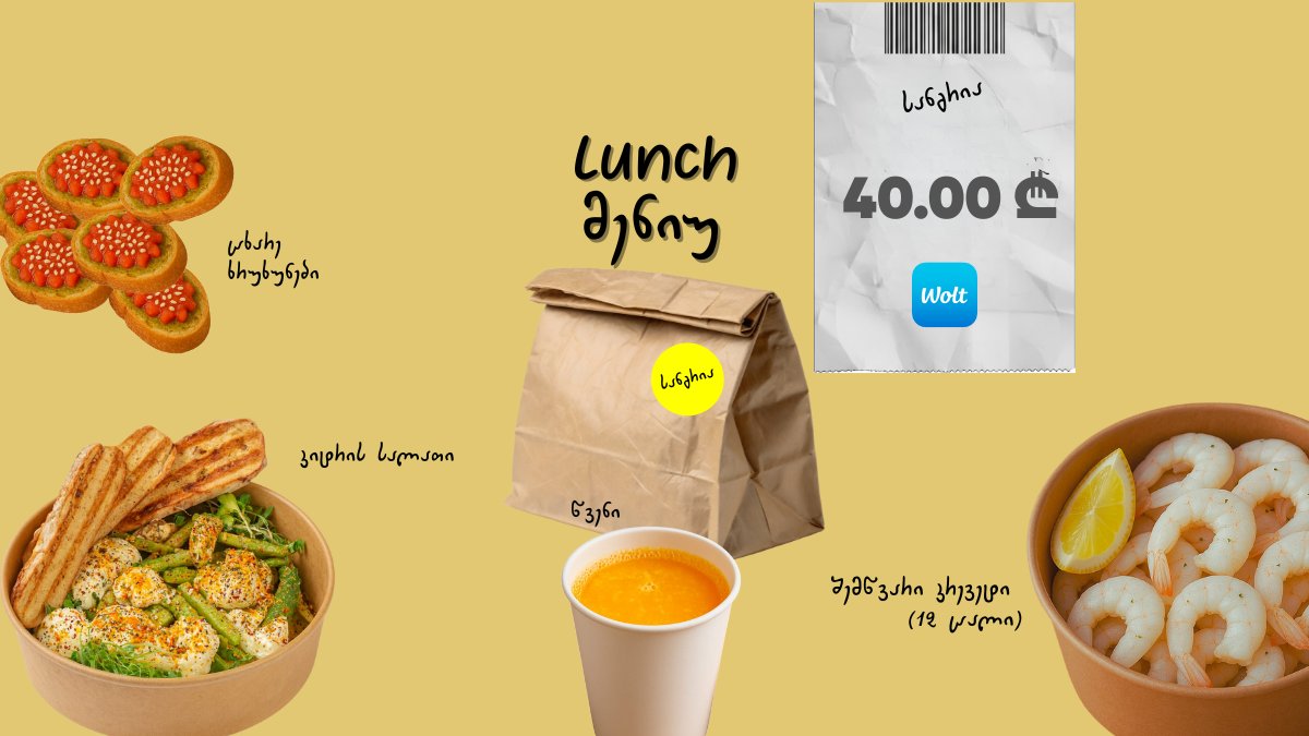 შემწვარი კრევეტები (12 ცალი), კიტრის სალათი, ცხარე ხრუხუნები, წვენი (ფორთოხალი ან ანანასი ან ალუბალი)