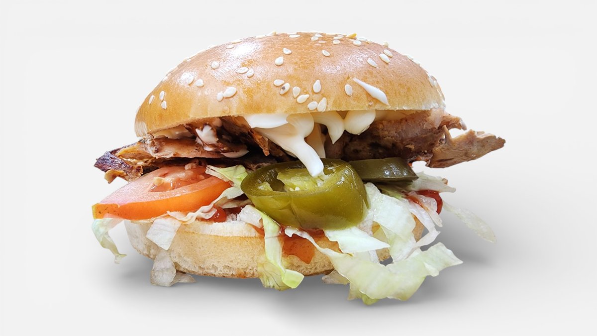 ბურგერის პური სეზამით, შაურმის ღორის ხორცი, კეჩუპი, მაიონეზი, სალათი, ხახვი, პომიდორი, ხალაპეიო წიწაკა.