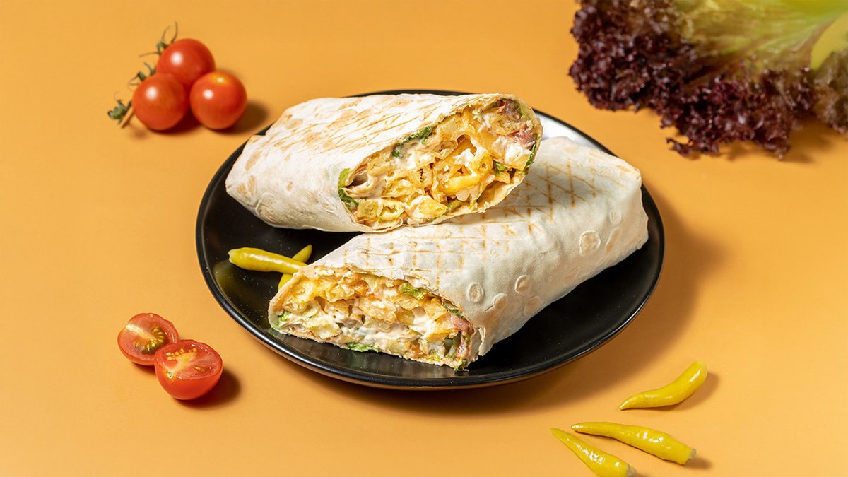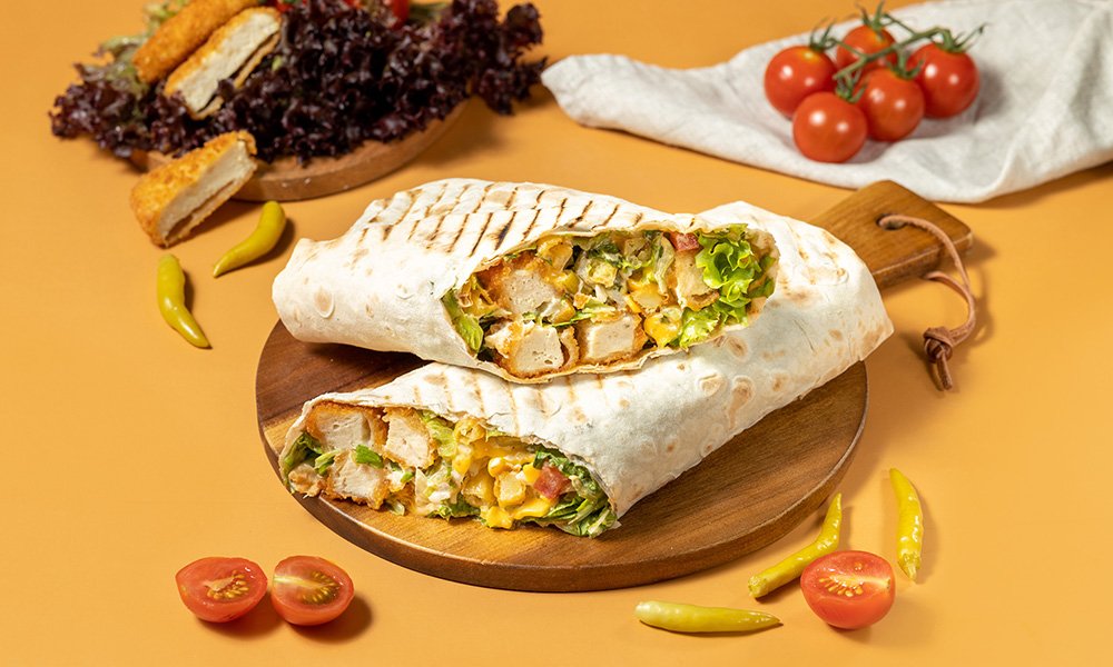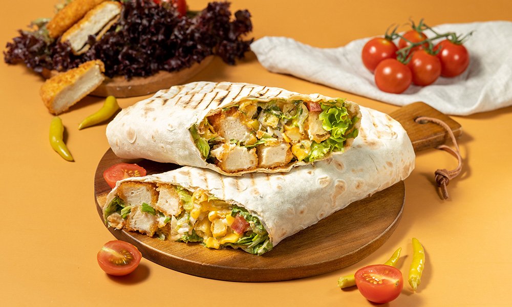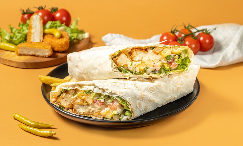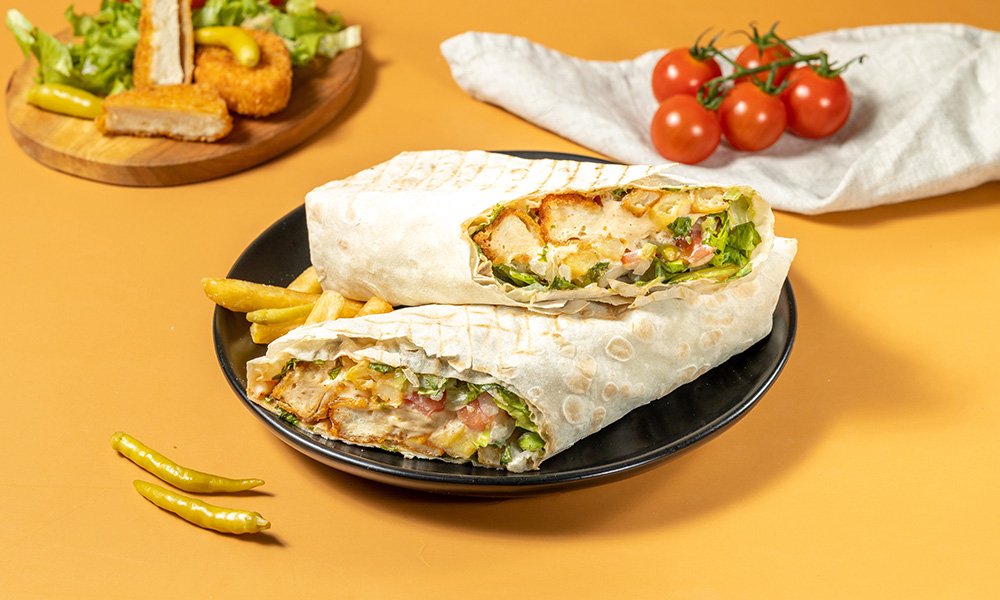 ქათმის დაბასტურმებული (ფილე) შემწვარი. სომხური ლავაში, ყველი ჩედარი, სალათა, პომიდორი, ხახვი, წიწაკა, კეჩუპი, მაიონეზი.