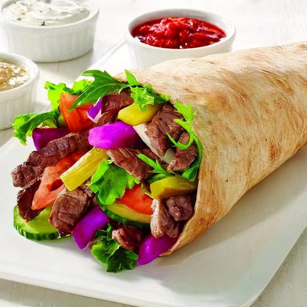 ლავაში, ღორის ხორცი, სარდელი, სალათა, ხახვი, პომიდორი, წიწაკა, კეჩუპი, მაიონეზი
