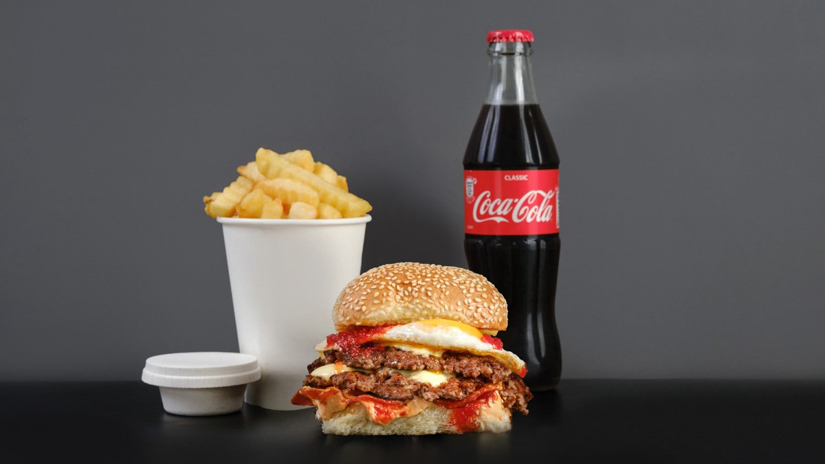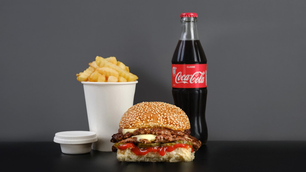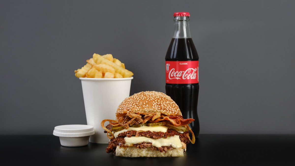 ბურგერი ბეკონისტი, კარტოფილი ფრი, სასურველი სოუსი, სასმელი