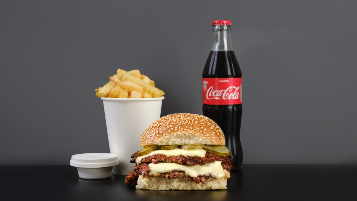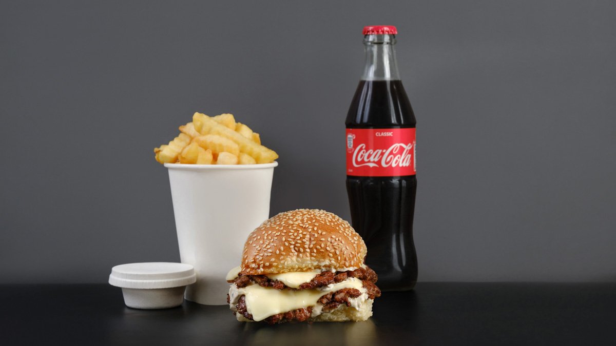 ჩიზბურგერის პონტში ბურგერი, კარტოფილი ფრი, სასურველი სოუსი, სასმელი