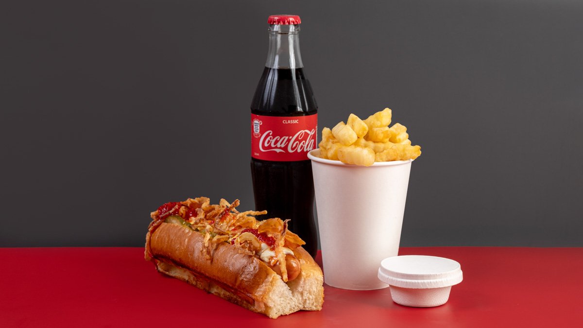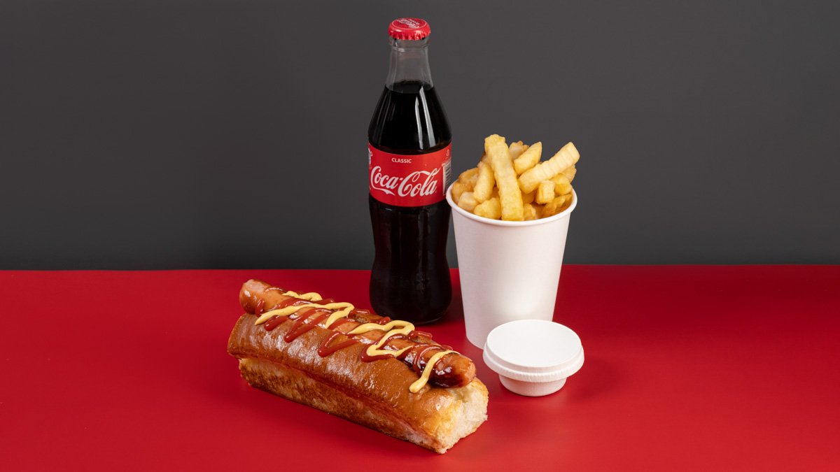 ჰოთდოგი სამსონა, კარტოფილი ფრი, სასურველი სოუსი, სასმელი