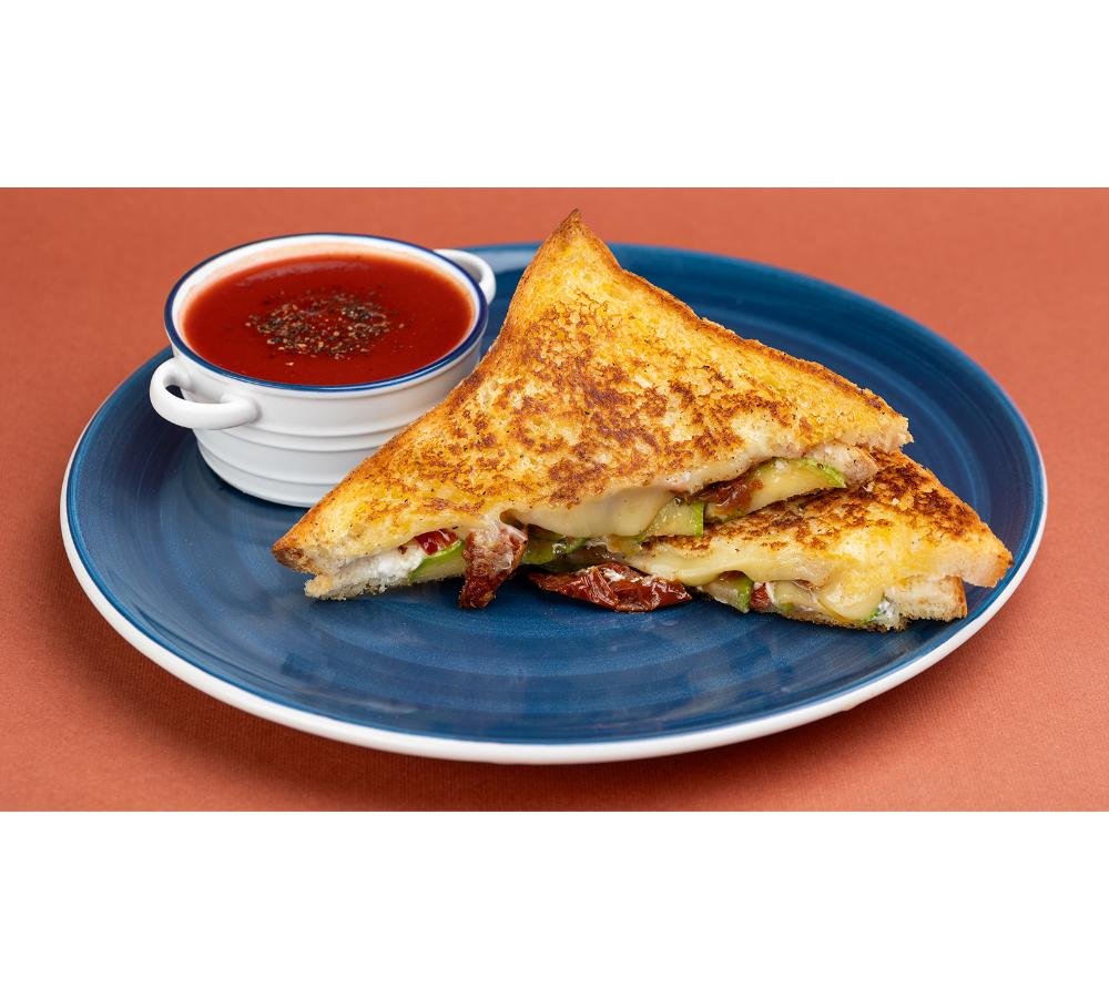 ტოსტის პური, ჩედარი და კრემ ყველი, მწვანე პესტო, პომიდვრის ჩირი, ყაბაყი, წითელი ბულგარული, ნაღების კარაქი