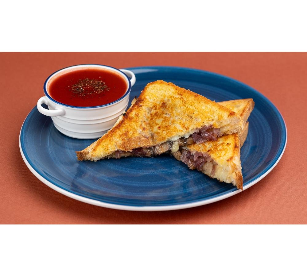 ტოსტის პური,შვეიცარიული და ლურჯი ყველი, კარამელიზებული ხახვი, შემწვარი სოკო, მიხაკი, ნაღების კარაქი