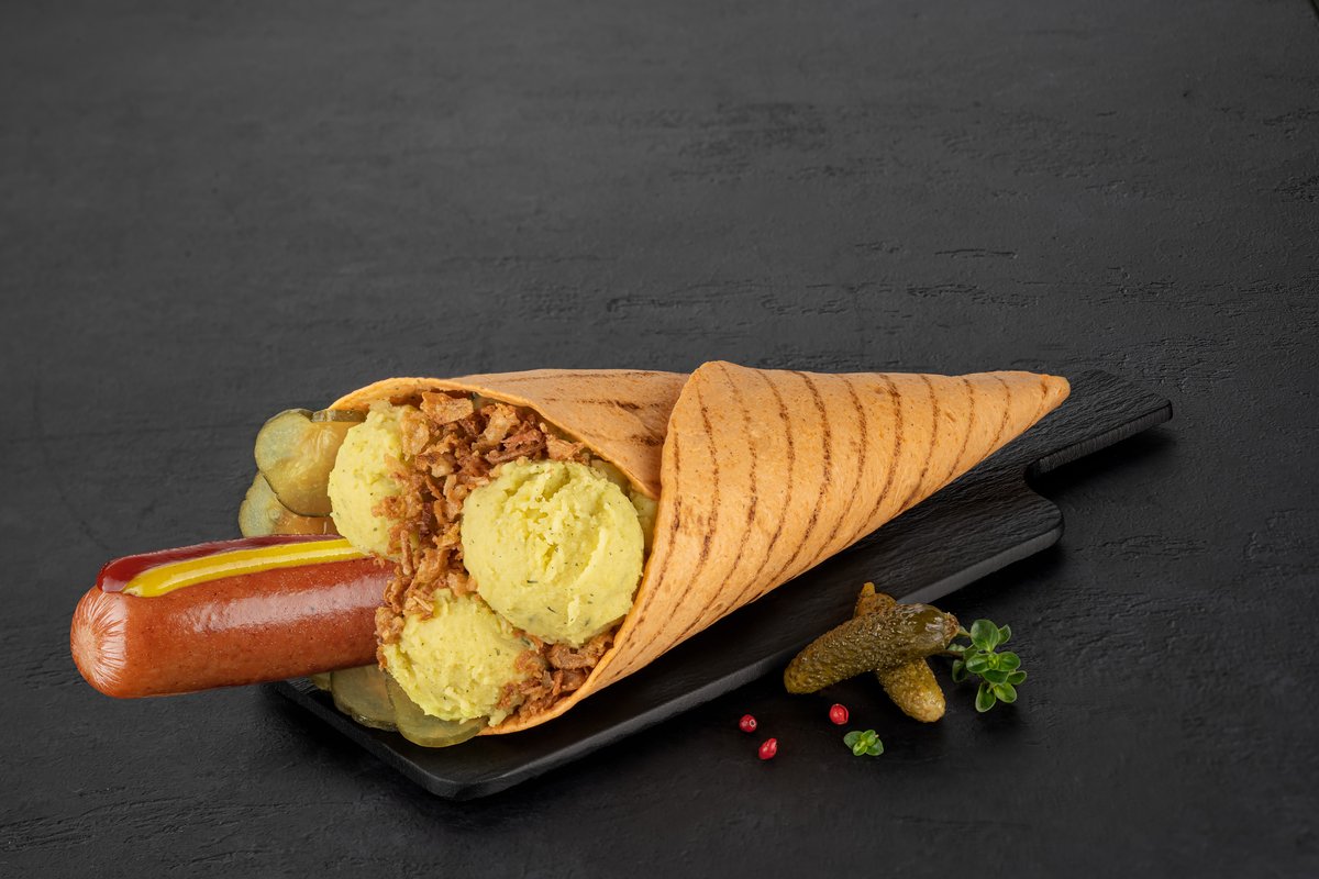 უნიკალური ჰოთ-დოგი ! პომიდვრის ტორტილია, ღორის და საქონლის ხორცისგან დამზადებული სოსისი კვამლის მსუბუქი არომატით, კარტოფილის პიურე, შემწვარი ხახვი, მჟავე კიტრი, 4 უგემრიელესი სოუსით