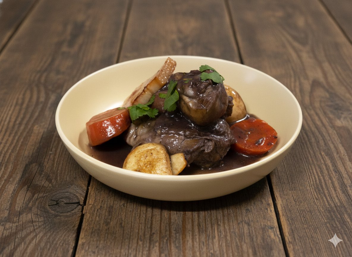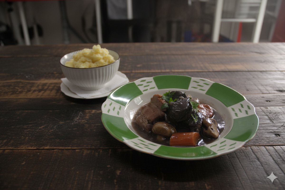 Beef and carrot stewed in a white wine tomato sauce with mashed potato.