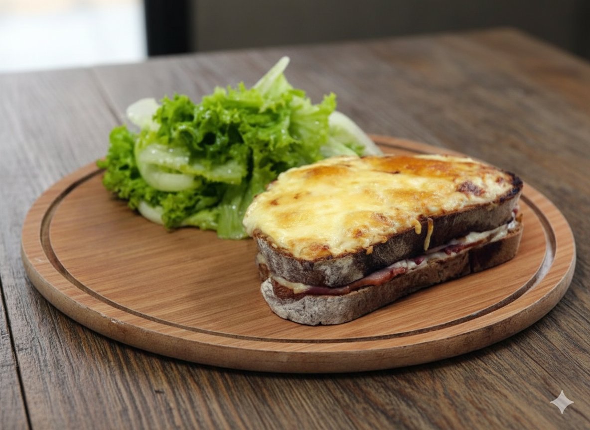 Warm brie on toast with green salad, cherry tomatoes and apple.