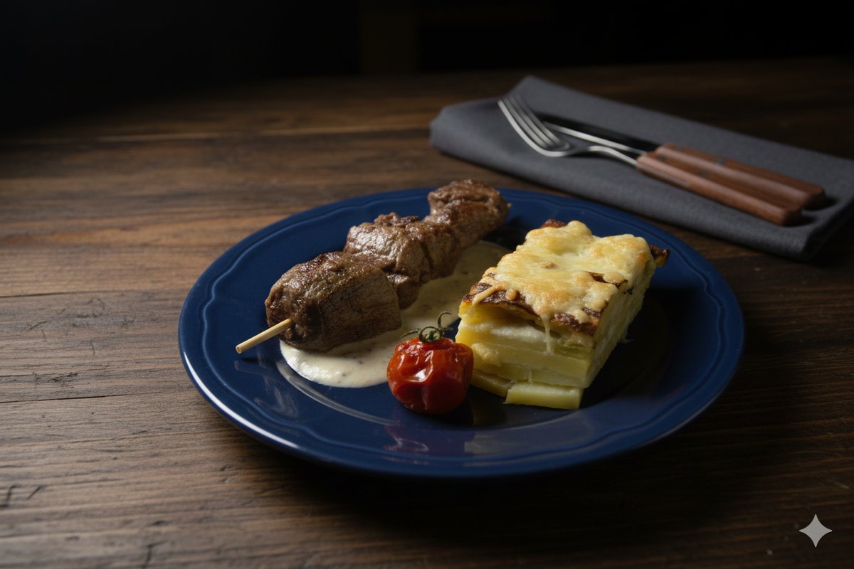 Beef tenderloin, peppercorn sauce, potato "gratin".