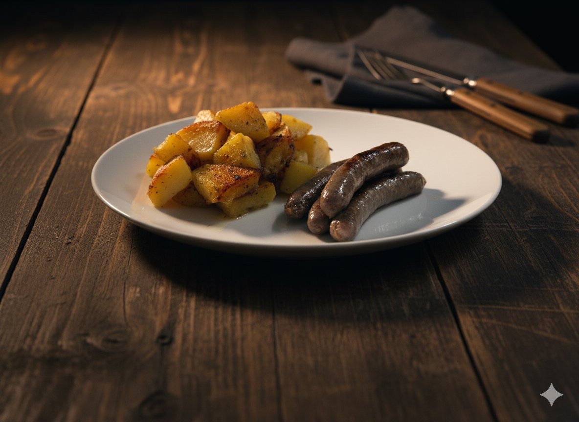 Beef sausages merguez with sauteed potatoes and harissa sauce (spicy).