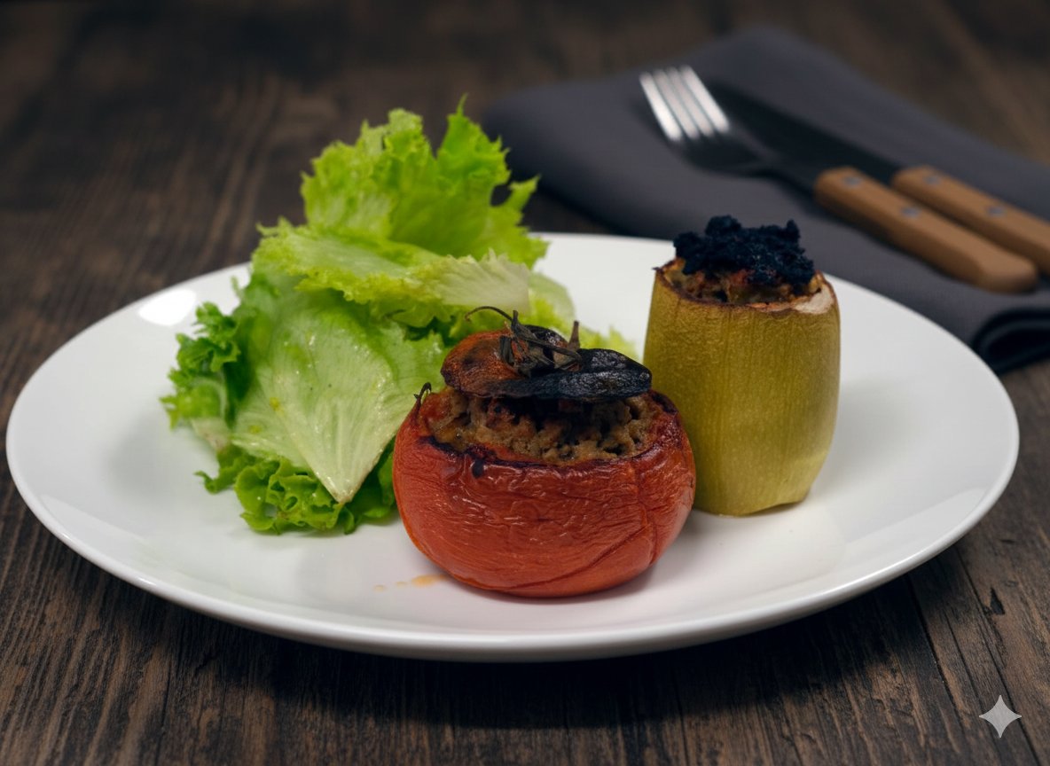 Stuffed tomato and zucchini with beef Bolognaise with green salad.