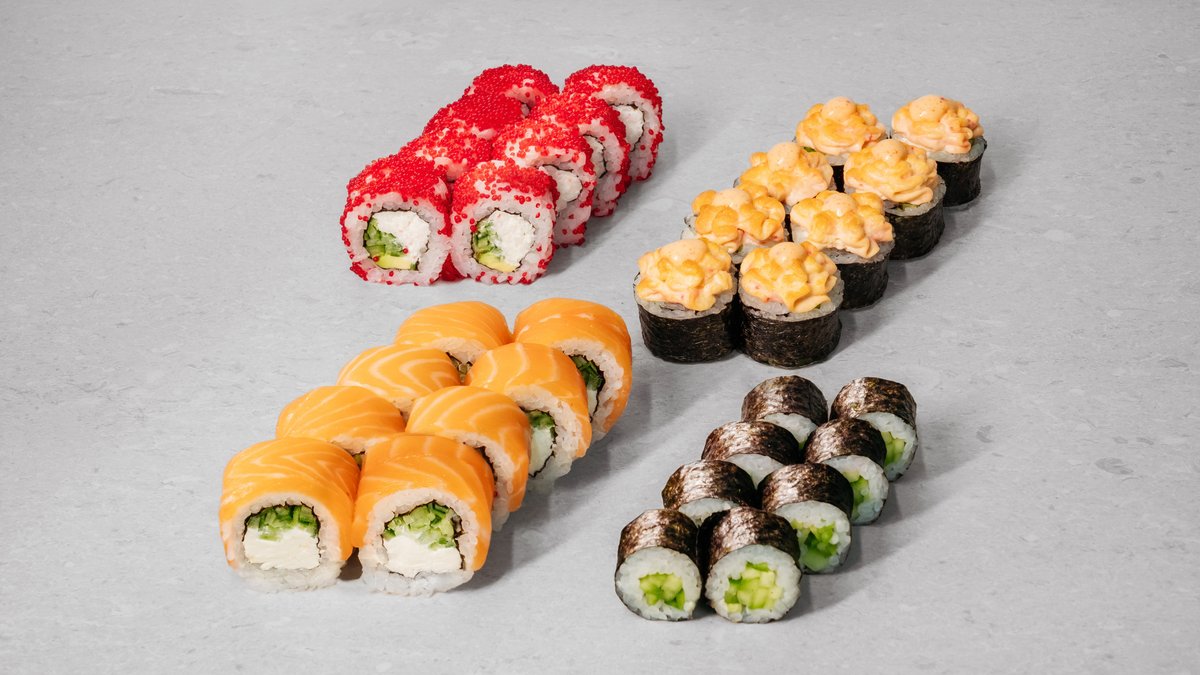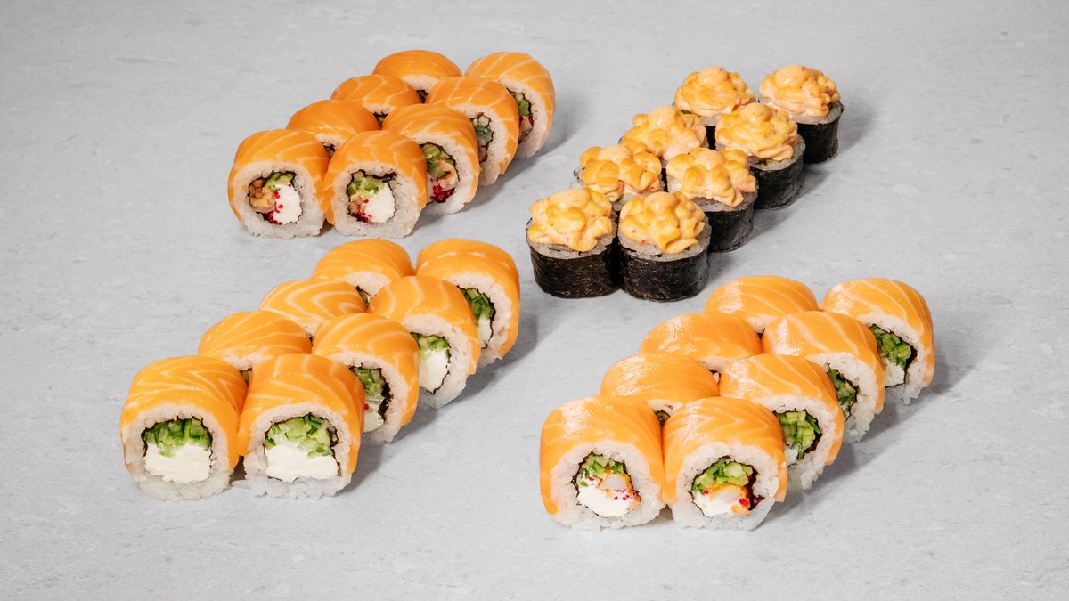 Philadelphia roll, Philadelphia roll with shrimp, Philadelphia roll with unagi, Philadelphia roll with baked salmon